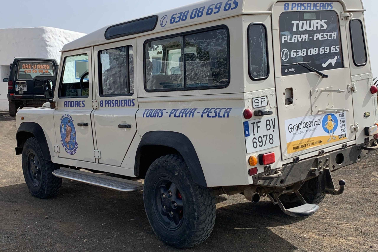 Goditi un'escursione piena di emozioni e divertimento intorno alla meravigliosa isola di La Graciosa. – Al Jeep Safari Andrés, di fronte alla chiesa di Caleta del Sebo, a soli 200 metri a piedi dal traghetto. 3 tour al giorno alle 10:30, 12:30 e 14:30. Massimo 22 persone divise in 3 diverse Jeep 6+8+8.