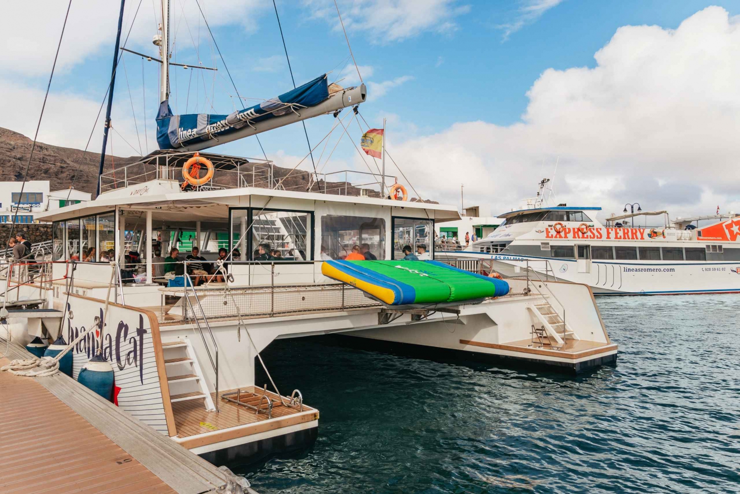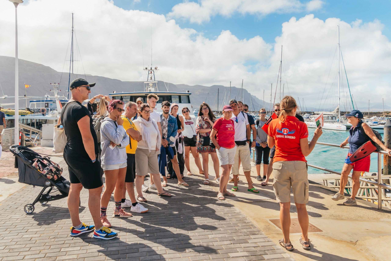 Navega pela costa de La Graciosa numa excursão guiada de catamarã com paragens para nadar e relaxar. Desfruta de um almoço local e aprecia as vistas a partir do barco. Começa o teu dia com um serviço de busca nas principais estâncias turísticas de Lanzarote e dirige-te para a aldeia nortenha de Órzola. Embarca num ferry expresso para a ilha de La Graciosa no porto de Caleta del Sebo. Explora a Caleta de Sebo durante algum tempo livre antes de desfrutares de um mojito de boas-vindas no catamarã. Depois de navegar durante algum tempo com WiFi gratuito para as tuas necessidades de conetividade, ancora na French Beach. Desfruta de um mergulho refrescante e experimenta algumas das actividades aquáticas, como snorkeling e caiaque. Senta-te para uma paella tradicional espanhola e um almoço de fruta fresca a bordo. Aproveita para beber cerveja, sangria, refrigerantes e água ilimitados no bar. Aprende sobre a área com o teu guia local. Regressa com uma breve paragem em La Graciosa.