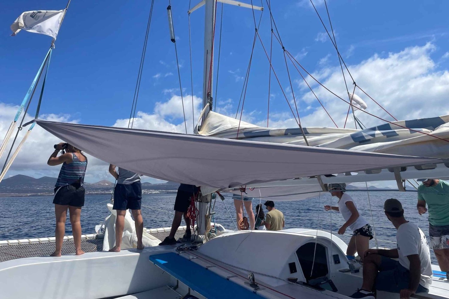 Embark on a serene and eco-friendly sunset tour aboard 'La Santa María,' Lanzarote's 100% electric catamaran. Glide silently along the breathtaking coastline and spot dolphin species like the Atlantic spotted dolphin and the common dolphin.